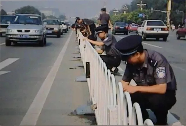 p style="text-align: center;">2001年民警在清洁长安街道路护栏。
