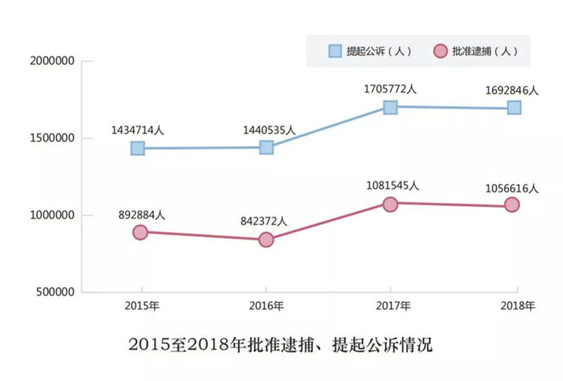 2018年是改革开放40周年,也是检察机关恢复重建40周年。在以习近平同志为核心的党中央坚强领导下,在全国人大及其常委会有力监督下,最高人民检察院坚持以习近平新时代中国特色社会主义思想为指导,全面贯彻党的十九大和十九届二中、三中全会精神,认真落实十三届全国人大一次会议决议,增强“四个意识”,坚持“四个自信”,做到“两个维护”,立足新时代人民群众对民主、法治、公平、正义、安全、环境等提出的更高要求,积极适应反贪转隶、检察职能调整,坚持讲政治、顾大局、谋发展、重自强,采取一系列主动跟进的思路举措,使转隶成为法律监督全面协调充分发展的转机,各项检察工作稳步向前。一年来,全国检察机关共批准逮捕各类犯罪嫌疑人1056616人,提起公诉1692846人,同比分别下降2.3%和0.8%;对刑事、民事和行政诉讼活动中的违法情形监督447940件次,同比上升22.4%;立案办理公益诉讼案件113160件。