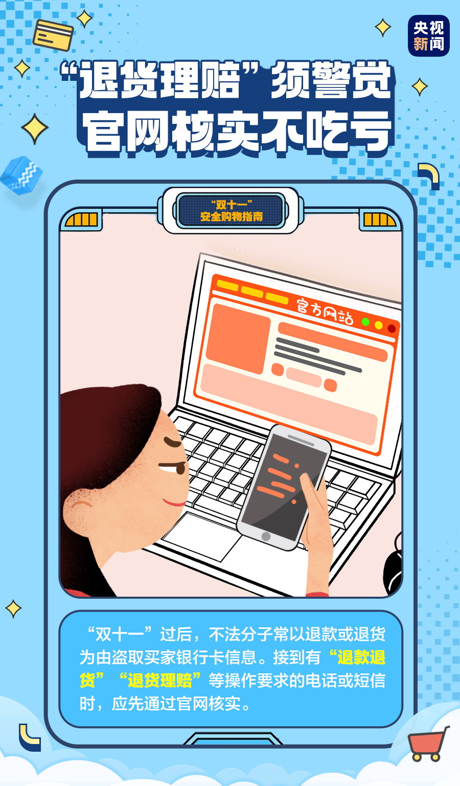 很多人希望趁着购物节,买到物美价廉的好东西。但也有一些不法商家或电信诈骗组织,企图利用消费者的贪便宜心理以及对规则的不了解,从中骗取钱财。今天,央视新闻为你准备了一份“双十一”安全购物指南,快来了解学习,谨防上当吃亏!