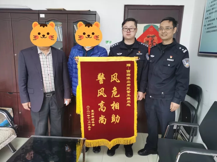 11月18日,村委会工作人员为派出所民警送来锦旗表达感激之情。