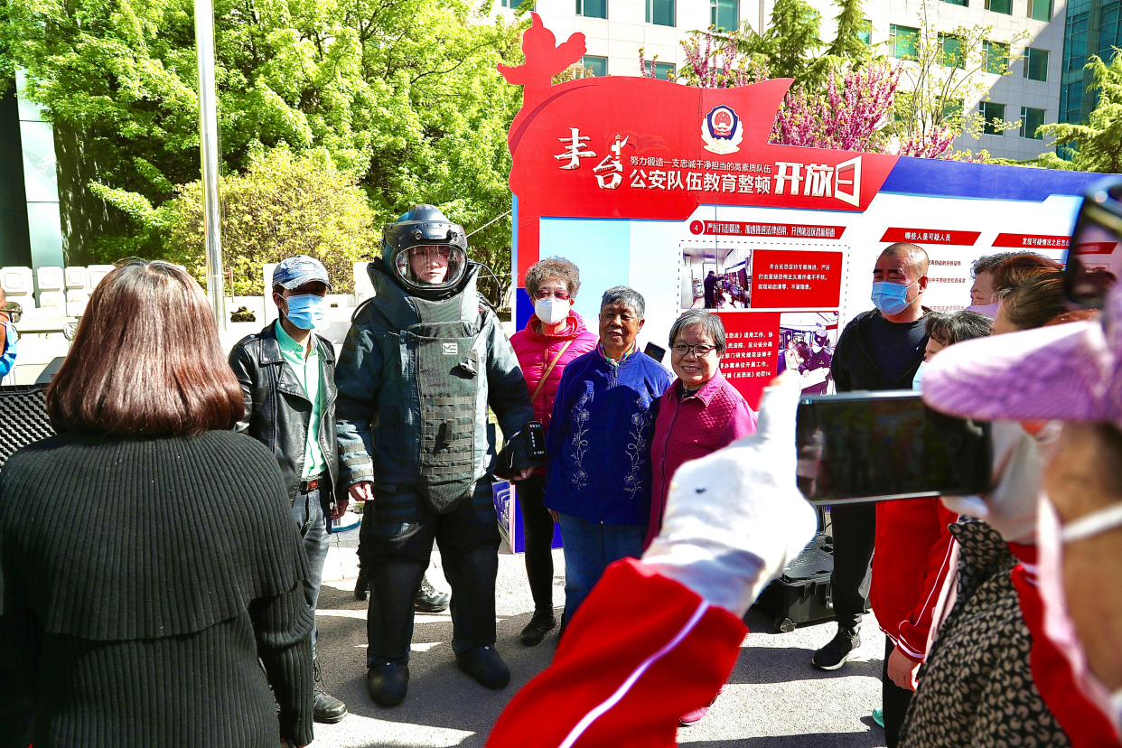“开放日”活动现场分为“英模群体”、“服务群众”、“警务发展”三个主题展区,让参加活动人员零距离感受别样“丰警”。在英模群体区域,各界代表通过现场展板、图片、实物、报刊等,对因公牺牲民警刘安同志的先进事迹及分局近两年获得荣誉情况进行了深入了解,还与5名受表彰的优秀民警代表进行了互动交流,听他们讲述了“丰警故事”。在服务群众区,丰台分局结合“4.15”全民国家安全教育日活动,开展了主题宣传,并现场进行了“突发事件处置”等科目演练;介绍了分局全面深化“放管服”改革中在治安、户政、出入境管理等方面推出的便民措施及取得的成效。在警务发展区,介绍了分局在110专项整治、融合执法、视频警务、反诈工作等创新举措,体现了丰台公安守护平安、守护百姓的信心和决心。