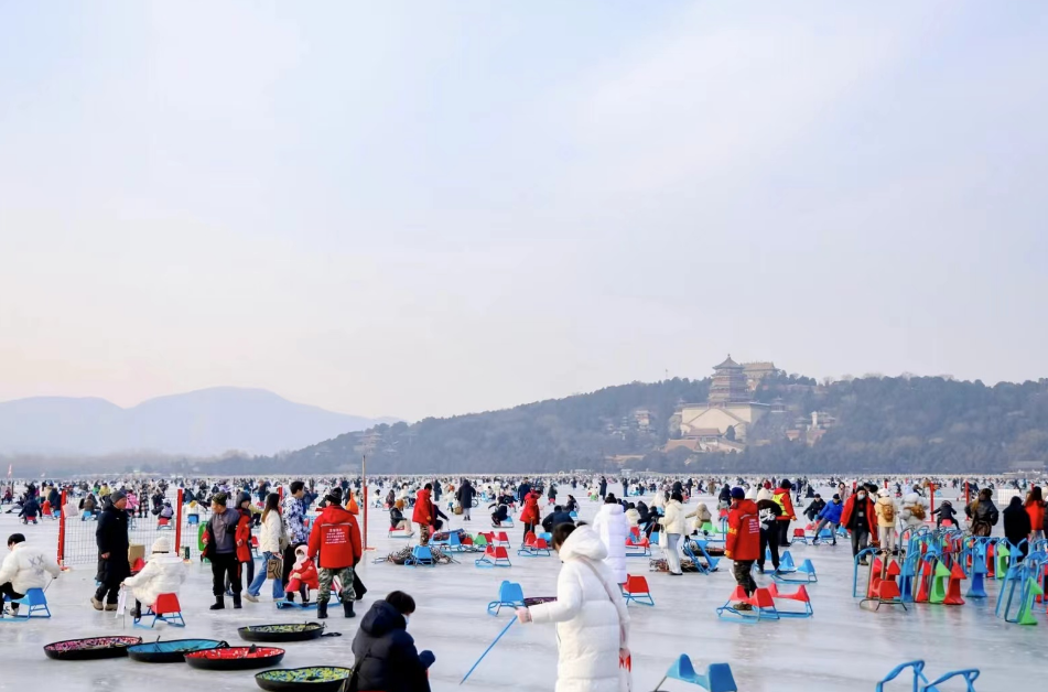 元旦假期首日,颐和园第十届冰上健体活动吸引众多市民和游客来园。昆明湖冰面上,冰上自行车、冰车的轨迹和游客们的欢乐笑声交织在一起,为冬季冰场注入了温暖与活力。昆明湖东岸东堤沿线“双奥之城”主题图片展,引来现场游客驻足观看,古典皇家园林内“后冬奥时代”的冬季运动活动氛围拉满。