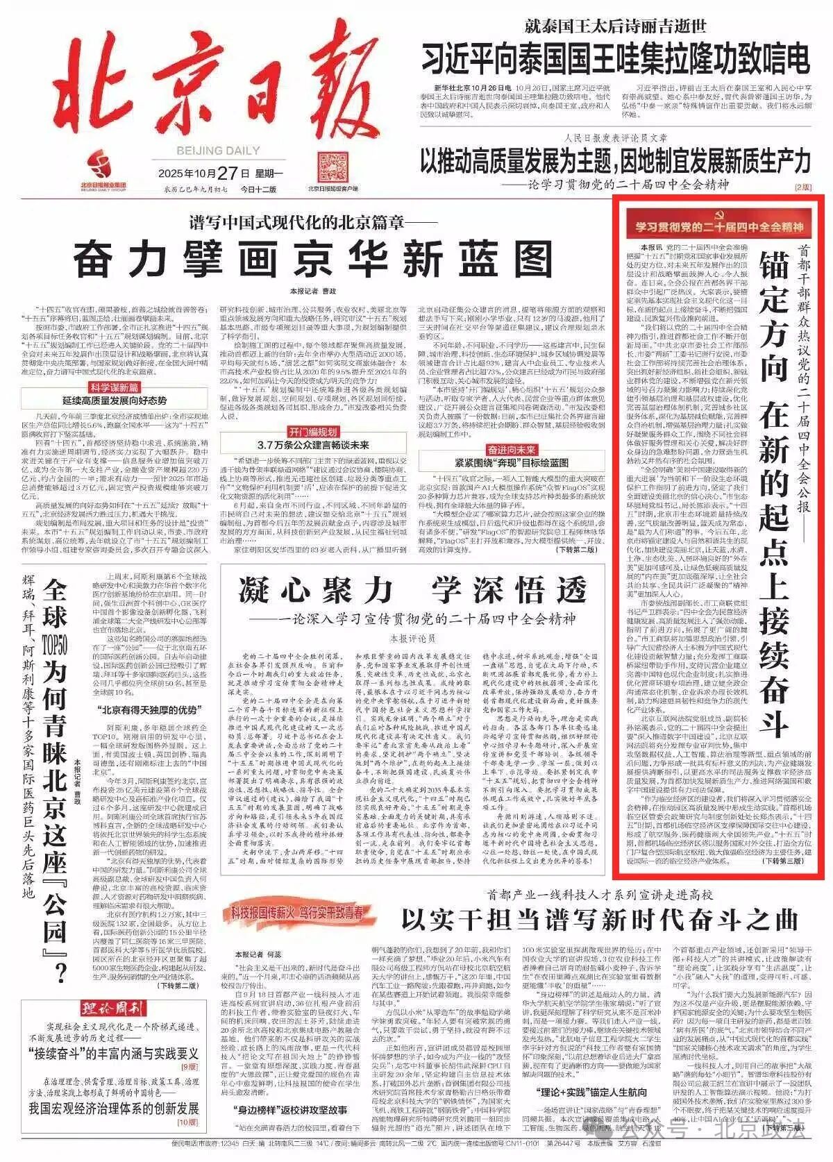 党的二十届四中全会准确把握“十五五”时期党和国家事业发展所处历史方位,对未来五年发展作出的顶层设计和战略擘画鼓舞人心、令人振奋。连日来,全会公报在首都各界干部群众中引起广泛热议。大家表示,要锚定率先基本实现社会主义现代化这一目标,在新的起点上接续奋斗,不断把强国建设、民族复兴伟业推向前进。