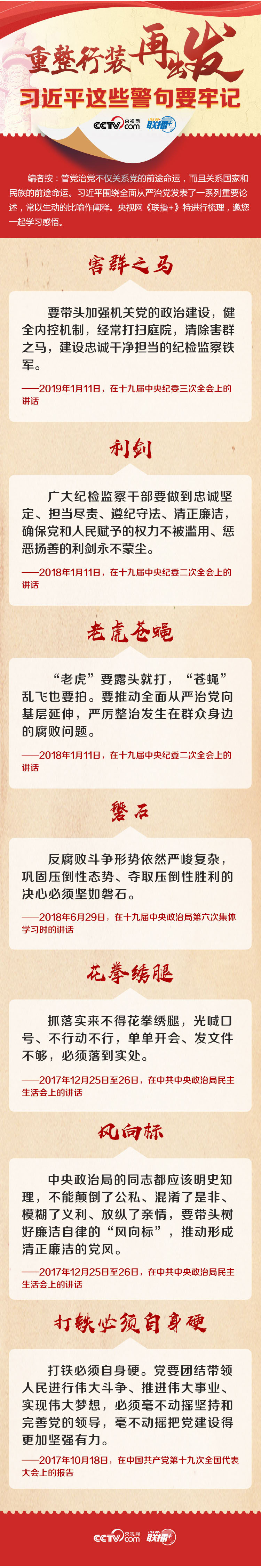 党的十九大以来,习近平总书记在众多场合对推动全面从严治党向纵深发展提出明确要求,字字铿锵有力、句句掷地有声。央视网《联播+》特梳理总书记治党话语,邀您一起学习感悟。