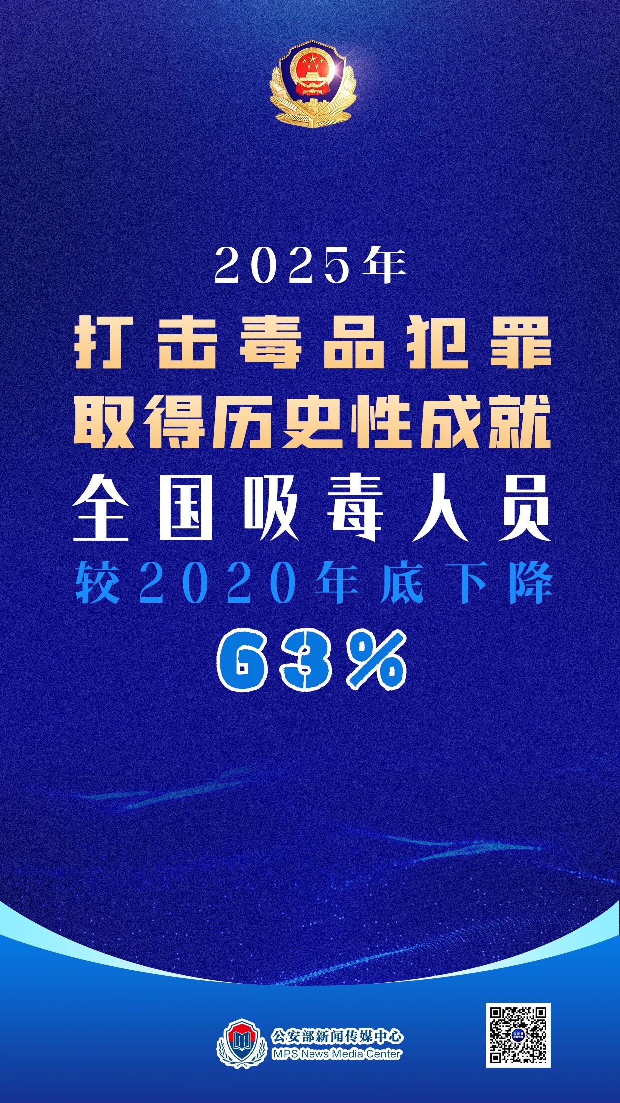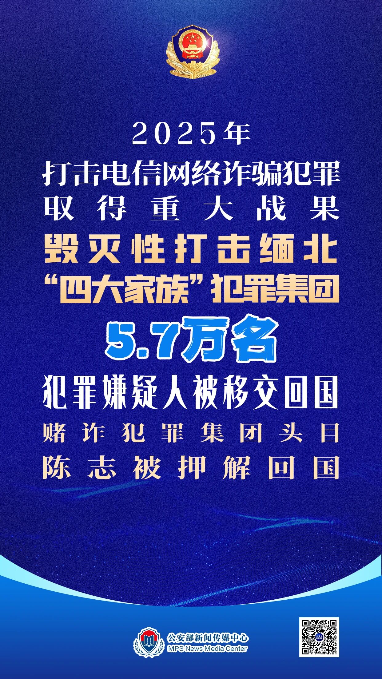 记者从会上了解到,2025年,打击电信网络诈骗犯罪取得重大战果,毁灭性打击缅北“四大家族”犯罪集团,5.7万名犯罪嫌疑人被移交回国,赌诈犯罪集团头目陈志被押解回国。打击毒品犯罪取得历史性成就,全国吸毒人员较2020年底下降63%。