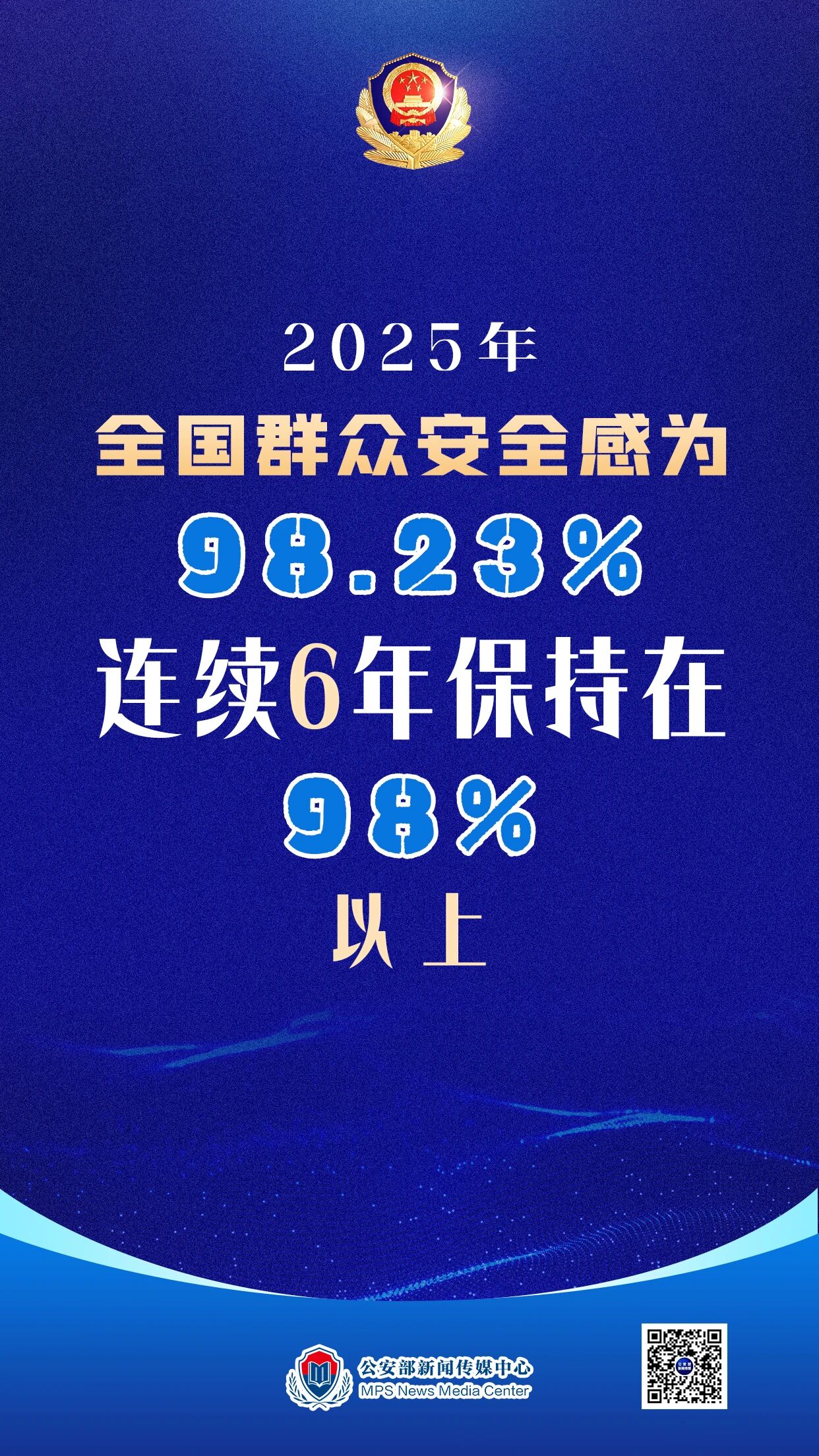 据了解,2025年,全国群众安全感为98.23%,连续6年保持在98%以上。全国刑事案件同比下降12.8%,为本世纪以来最低;治安案件同比下降3.5%,社会治安形势持续向好。