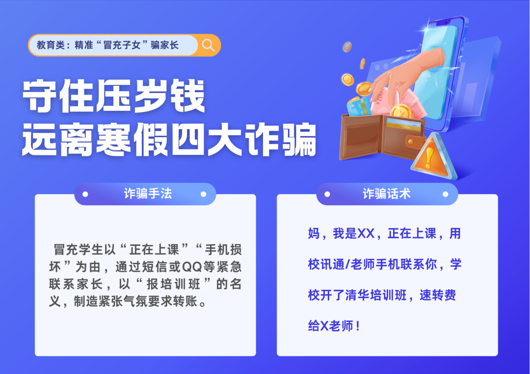 寒假临近,广大学生即将进入欢乐的假期,拥有了相对自主的时间安排。但在轻松的假期氛围下,学生遭遇电信网络诈骗风险隐患显著上升。学生社会阅历有限,易被诈骗分子精心设计的手法和话术误导,最终造成财产损失。结合过往案例分析,以下四类骗术在寒假期间发案率较高,学生本人及家长均需高度警惕,严守财产安全防线。