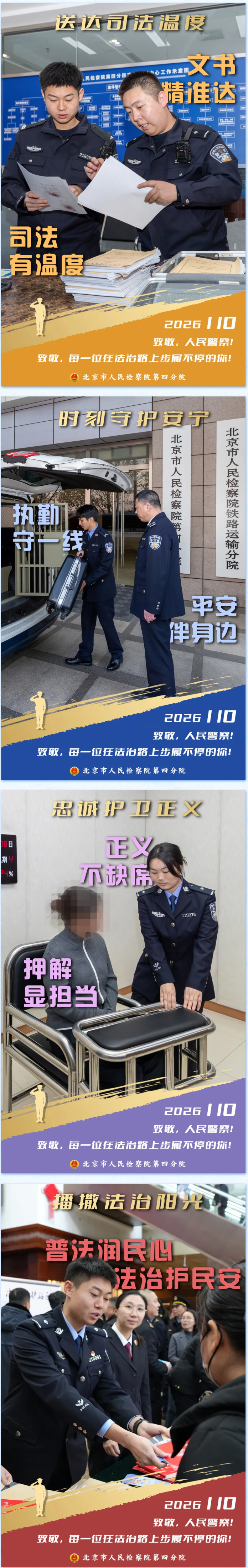 2026年1月10日是第六个“中国人民警察节”,我们向每一位在平凡岗位上默默奉献的人民警察致以最崇高的敬意!在北京市检察机关,有这样一支司法警察队伍:他们扎根在检察履职一线,以忠诚专业守护司法公正与温度。让我们透过四组海报,走进检察机关,看看司法警察的日常,感受检察蓝中的警徽荣耀。