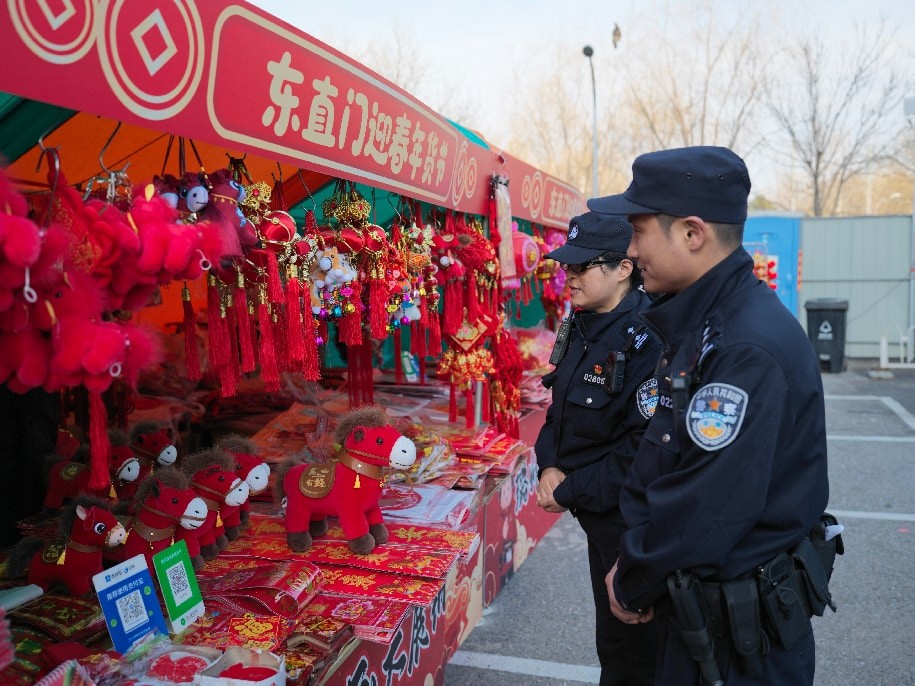 在朝阳区全国农业展览馆举办的第30届老北京年货大集上,天南海北的特色年货、老字号产品汇聚一堂,非遗传承人现场演示捏面人、绘糖画等技艺,引得群众驻足观看。朝阳公安分局麦子店派出所民警们紧盯大集出入口、热门摊位等人员密集区域,采取“定点值守+动态巡逻”的方式,加强显性用警、巡逻守护,及时发现排查安全隐患,并会同主办方实时掌握客流量,当入口排队过长时,民警将与工作人员及时疏导人群,避免拥挤踩踏。