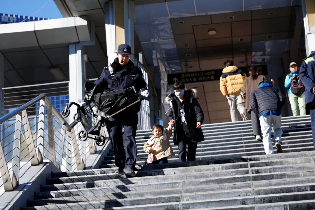 △过街天桥上,民警帮助群众抬起婴儿车,将母子安全送到桥下。