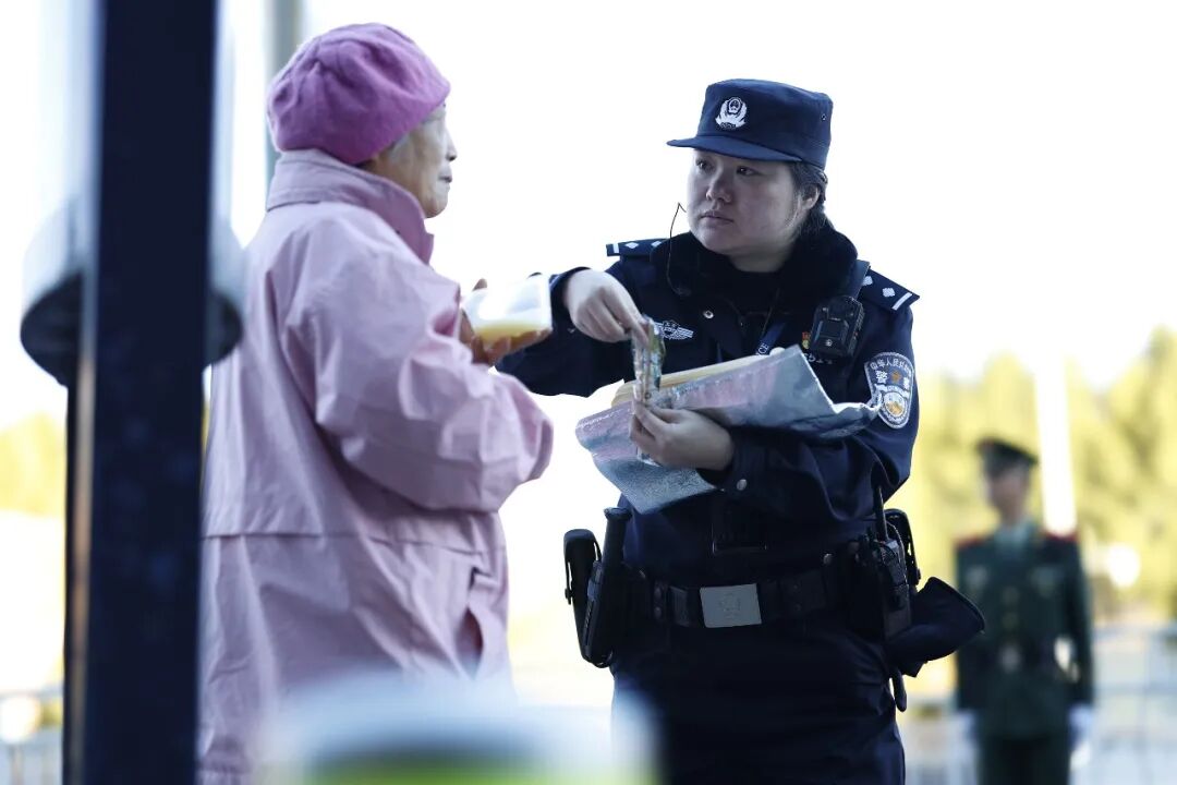 △赛道沿线,一位老人突发低血糖症状,民警第一时间递上食物,缓解了老人不适。
