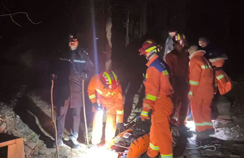 几分钟后,留守山脚的民警和消防救援人员一同赶到。此时天色正快速暗下来,山间气温骤降,受伤男子因久坐受寒,体温逐渐下降,身体已有些僵硬。为尽快脱离险境,救援人员先尝试搀扶伤者缓慢下山。但没走多远,受伤男子便因体力不支无法继续前进。救援人员迅速展开担架,小心翼翼地帮伤者固定。随后,救援人员轮流抬着担架,在山石嶙峋的路上手脚并用,谨慎前进。经过三小时的艰难跋涉,救援队伍最终将受伤男子安全送至山下就医。