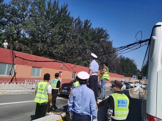 据介绍,当日上午6时许,正在京藏高速辅路回龙观桥附近执勤的昌平交通支队回龙观大队协警赵勤生、陈长征发现路段出现车辆排队积压,随即前往查找原因,现场发现有多根电线散落地面,造成过往车辆无法通行。两人一边将情况向大队指挥室进行报告,通报相关部门处理隐患,一边从附近找来一根木棍托举电线,为途经车辆临时撑起可通行空间,并提示过往车辆行人注意安全。