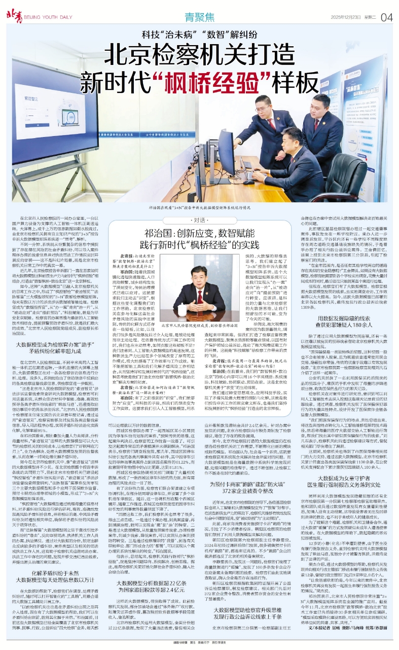 如今,这种“大数据模型”已融入到北京检察机关的日常工作之中,形成了“枫控智检”“索迹智见”“法脉智鉴”三大模型领衔的“3+N”数智检察模型矩阵,每天有数以十万计的涉法涉诉数据被智能处理。检察官成为了“数据指挥官”,从“办一案”走向“治一片”,从“被动应对”走向“提前预防”。“科技赋能,就是为平安北京赋能。检察官的办案思维与最新的人工智能技术相结合,提前预警预防矛盾纠纷,就是我们最大的成效。”北京市人民检察院党组成员、副检察长祁治国说。