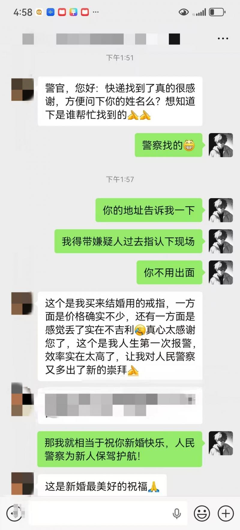 “民警太给力了!婚戒意义特殊,失而复得真替新人开心,必须点赞!”“这才是人民警察中‘人民’两个字的含金量”......面对网友的夸赞,办案民警白淇尹不好意思地回应道:“这都是我们应该做的!”