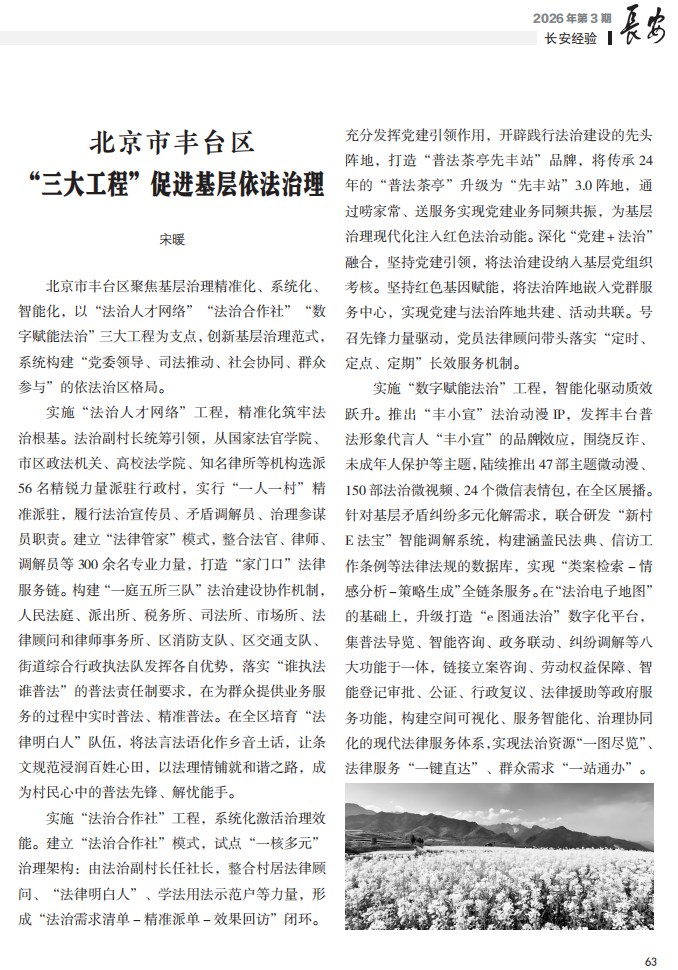 北京市丰台区聚焦基层治理精准化、系统化、智能化,以“法治人才网络”“法治合作社”“数字赋能法治”三大工程为支点,创新基层治理范式,系统构建“党委领导、司法推动、社会协同、群众参与”的依法治区格局。