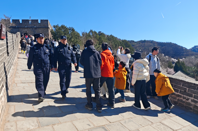 同时,针对“长城醒山季”客流高位运行的情况,延庆警方紧盯景区入口、观景台、狭窄通道等人员密集区域。在八达岭长城景区,实行“缓进快出、分段管控”模式,在狭窄通道、陡峭台阶处增派警力,引导游客单向通行、有序避让,严防人流对冲;在城墙沿线加大巡逻频次,联合景区工作人员、护林员开展值守,及时查处各类违法行为,营造良好治安环境。